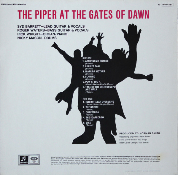 Almost identical to Pink Floyd - The Piper At The Gates Of Dawn, but there is no THE PINK FLOYD writing (tilted) in the lower right corner of the back cover.