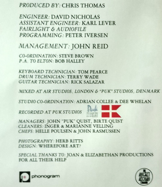 - Backing Vocals – Davey Johnstone (tracks: A1, A2, A4 to B1, B3 to B5), Marlena Jeter (tracks: A2, A5, B1, B3, B4), Mortonette Jenkins (tracks: A2, A5, B1, B3, B4), Natalie Jackson (tracks: A2, A5, B1, B3, B4)