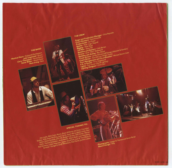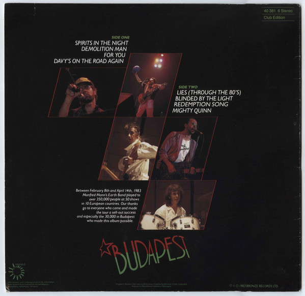 Between February 8th and April 14th, 1983 Manfred Mann's Earth Band played to over 350,000 people at 50 shows in 10 European countries. Our thanks go to everyone who came and made the tour a sell-out success and especially the 30,000 in Budapest who made this album possible.