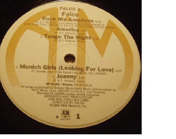 "R" printed at the bottom of the labels to the left of the A&M logo denotes an RCA Records Pressing Plant, Indianapolis pressing. Similar to label variant Falco 3 but that edition states published by Colgems EMI Music, Inc.