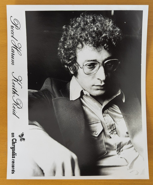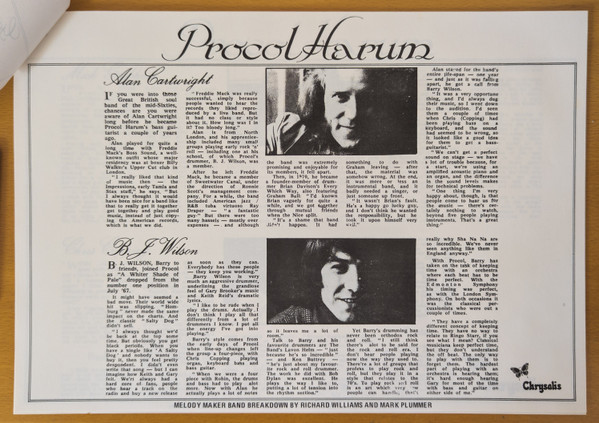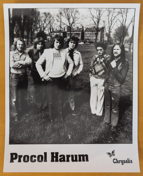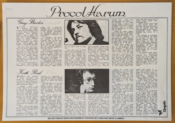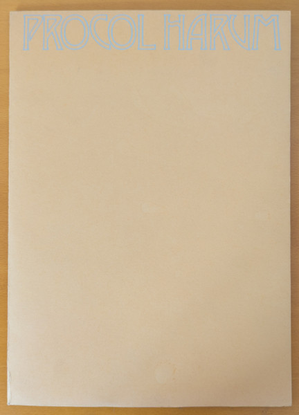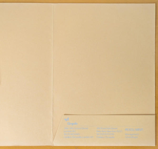 Some copies included a beige folder with black and white photos of Gary Brooker, Keith Reid, and the band. The back of the Gary Brooker photo has a rubber stamp on it stating Brian Cooke, Visualeyes Ltd. 11 Blenheim Cres. London, W11, 01-727 1533., . Also included was a 3 page bio of the members marked Melody Maker Band Breakdown by Richard Williams and Mark Plummer. Link to Brian Cooke Brian Cooke (2).