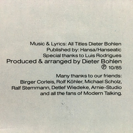 Many thanks to our friends: Birger Corleis, Rolf Köhler, Michael Scholz, Ralf Stemmann, Detlef Wiedeke, Arni-Studio and all the fans of Modern Talking.