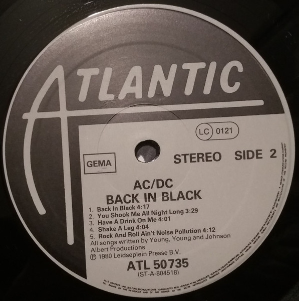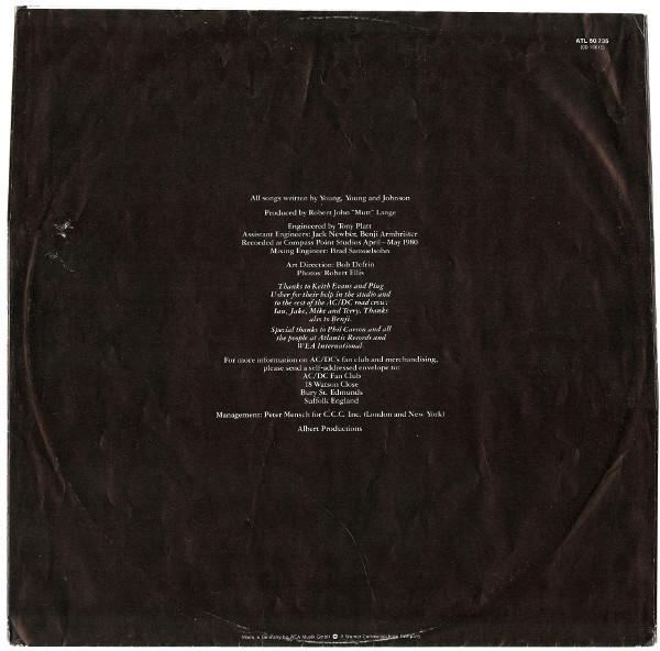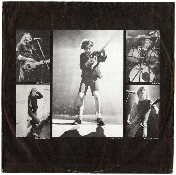 The inner sleeve shows black-and-white live pictures of the band members, except for Brian Johnson, who was new in the band at the time and had not performed yet with AC/DC.