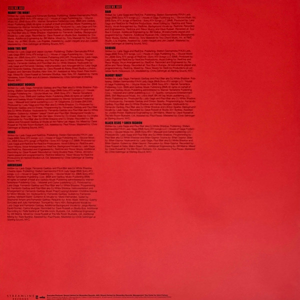 Track A1 - Publishing: Stefani Germanotta P/K/A Lady Gaga (BMI) Sony ATV songs LLC / House Of Gaga Publishing Inc. / GloJoe Music Inc. (BMI) Sony ATV / Warner-Tamerlane Publishing Corp. (BMI) and Garibay Music Publishing (BMI). All rights on behalf of itself and Garibay Music Publishing administered by Warner-Tamerlane Publishing Corp. Recorded on Studio Bus. Mixed by Tony Maserati for Two Chord Music, Inc. at RMC Studio, Los Angeles. Mastered at Sterling Sound, NYC.