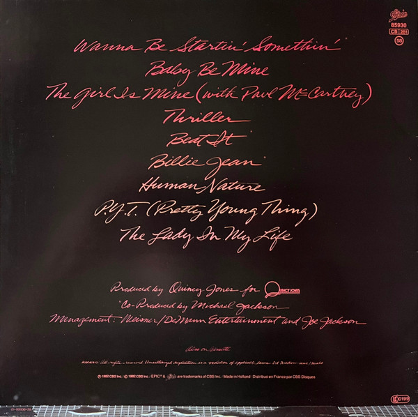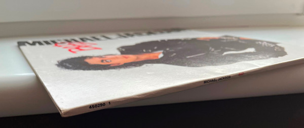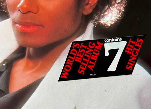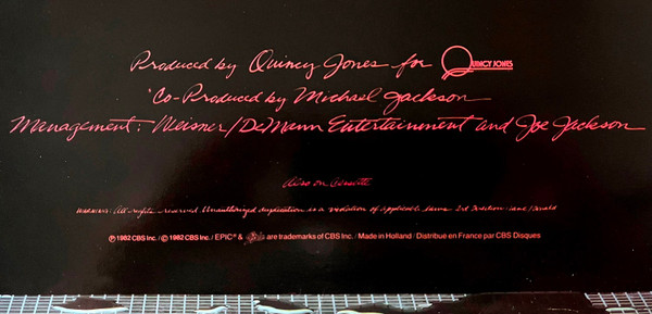Issued with a front cover medium sticker (red on black) stating "WORLD'S BEST SELLING ALBUM contains 7 HIT SINGLES" and a one sided colour insert with promotional information about Michael Jackson's and The Jacksons' previous albums released on Epic.