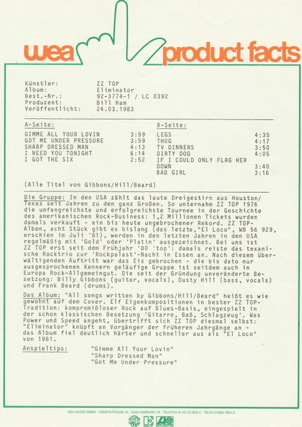 Some copies came with a 'WEA Product Facts' promotional sheet (size A4) with German text.