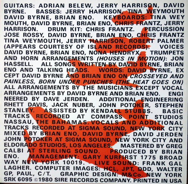 - Guitar – Adrian Belew, David Byrne, Jerry Harrison