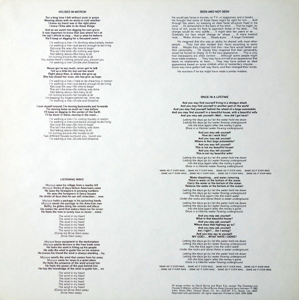 - Words By – Brian Eno (tracks: A1, A2), David Byrne