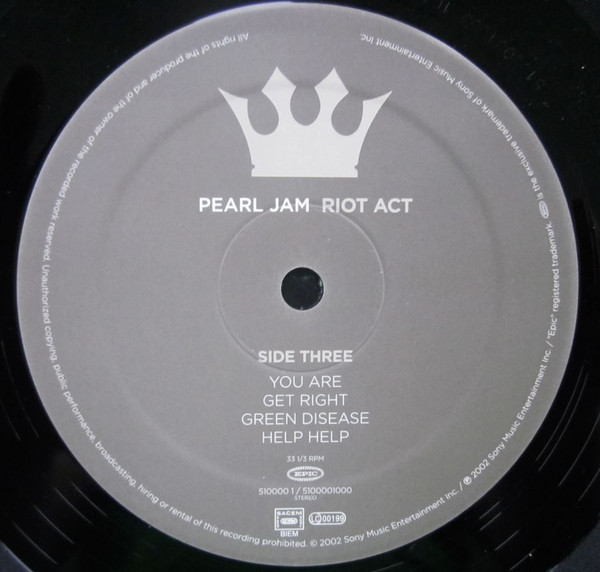 Comes with a colored booklet containing lyrics, photos and credits in a gatefold sleeve with a wide spine and a black rectangular sticker attached to the upper right of the front sleeve - reading 'PEARL JAM' (in white lettering) & 'RIOT ACT' (in dark green lettering).