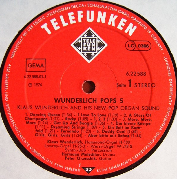 - Organ [Hammond-Orgel H100, Lowrey-Orgel H-25-3, Wersi-Orgel W-248-S], Synthesizer [Synth.-Baß], Percussion – Klaus Wunderlich