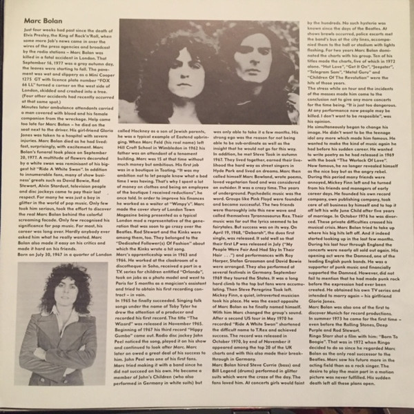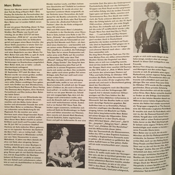 Gatefold sleeve with inserted 12"x12" four-page booklet including paintings and English and German biographical text about Marc Bolan's life and death.