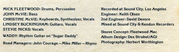 - Vocals – Christine McVie, Lindsey Buckingham, Stevie Nicks