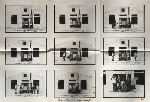 First shows the same text as the sticker and nine different black and white photos of an old shed, with and without band members. However in every picture the colored planets come back.