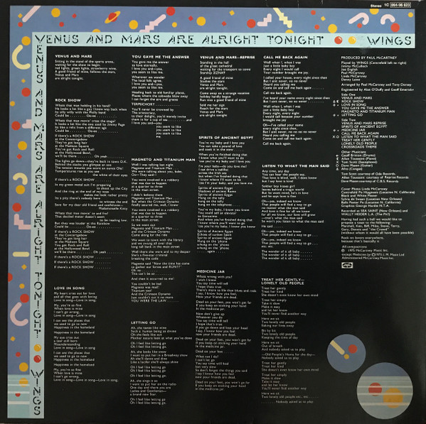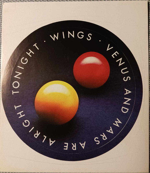 Comes with a separate round sticker showing the red and yellow planets from the front cover and on the edge the text (all around the sticker): Wings. Venus and Mars are alright tonight.