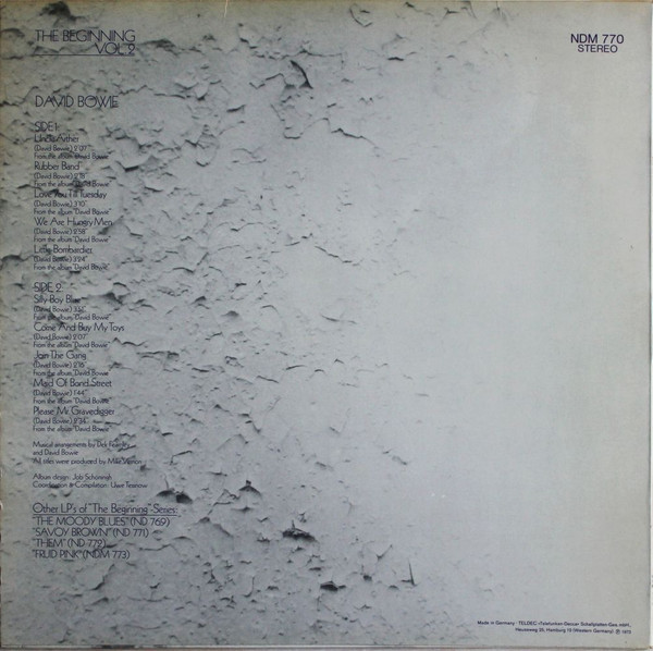 Quite possibly the first pressing of this compilation, due to the label design, machine-stamped matrices on runouts and the absence of the catalog number found on subsequent pressings, such as David Bowie - The Beginning - Vol. 2.