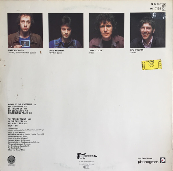 - The "Dire Straits" guitar on the backside above the label code is black here;