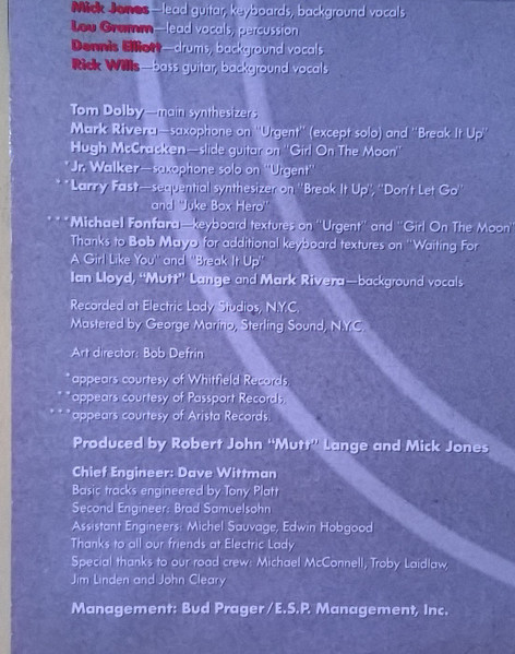 - Producer – Mick Jones (2), Robert John "Mutt" Lange*