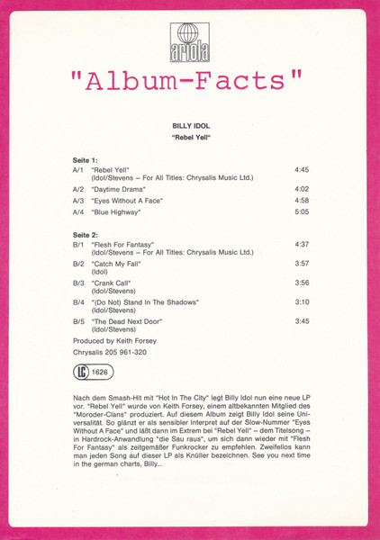 - Some copies include an Ariola insert with "Album-Facts" in German language.