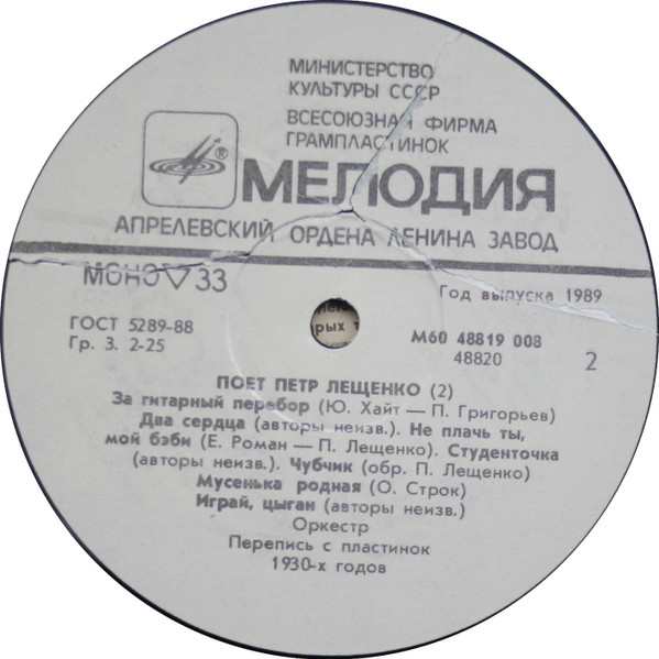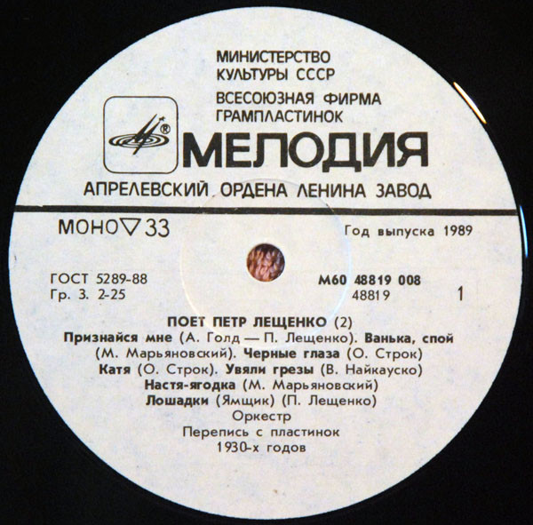 При подготовке второй пластинки П. Лещенко были использованы собрания пластинок В. Д. Абрамова, В. Д. Сафошкина (Москва), Центрального государственного архива звукозаписей СССР, а также фотоматериалы, предоставленные Е. Строком (Рига), Н. Невским (Иваново). Студия благодарит за оказанную помощь. [In the preparation of the second record by P. Leshchenko, the collections of records by V. D. Abramov, V. D. Safoshkin (Moscow), the Central State Archive of Sound Recordings of the USSR, and also photographs provided by E. Strok (Riga), N. Nevsky (Ivanovo) were used. The studio is grateful for the help provided.]