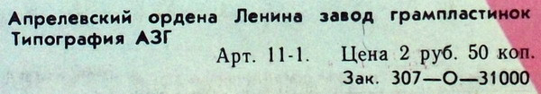 - Pressed By – Апрелевский Завод Грампластинок