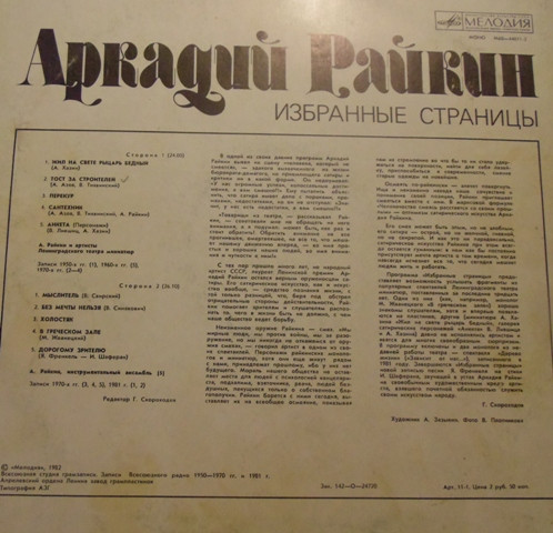 - Words By – А. Хазин* (tracks: A1, A5), А. Райкин* (tracks: A3, A4), В. Сквирский* (tracks: B1), В. Лившиц* (tracks: A4), В. Синакевич* (tracks: B2), В. Тихвинский* (tracks: A2 to A4), И. Шаферан* (tracks: B5), А. Азов* (tracks: A2 to A4), М. Жванецкий* (tracks: B3, B4)