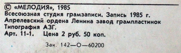 Всесоюзная студия грамзаписи. Запись 1985 г.