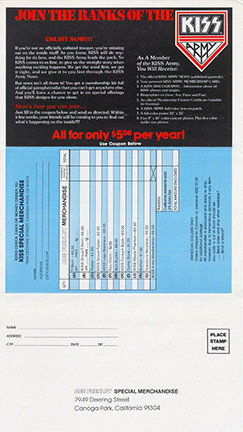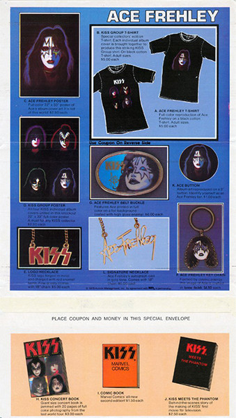 Issued with a color poster, double-sided insert / offer for the "Kiss Army" and various Kiss and Ace Frehley merchandise. Inner sleeve pictures the solo albums by all four members of Kiss.