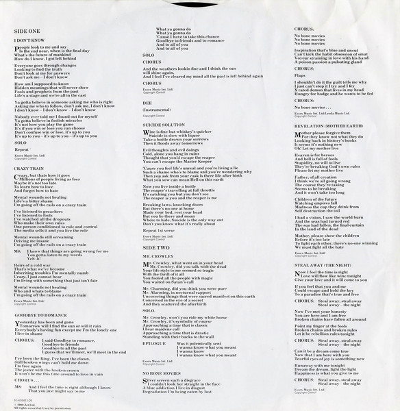 - Producer – Daisley*, Kerslake*, Osbourne*, Rhoads*