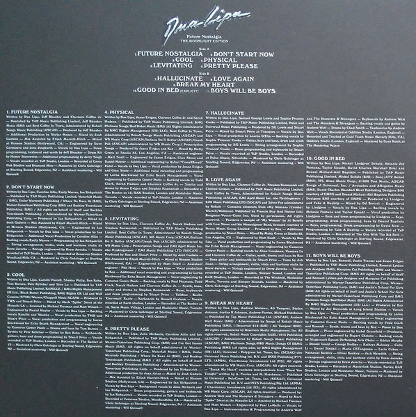 A Warner Records UK Release ℗ & © 2021 Dua Lipa Limited under exclusive license to Warner Music UK Limited. Except tracks 3, 4, 5, 6, 7, 8, 9, 10, 11, 12, 18 ℗ 2020, tracks 1 & 2 ℗ 2018 Dua Lipa Limited under exclusive license to Warner Music UK Limited, track 14 ℗ 2020 RCA Records, a division of Sony Music Entertainment, track 19 ℗ 2020 Sueños Globales, LLC. Exclusively licensed to UMG Recordings Inc. ℗ Universal Music Latino/NEON16