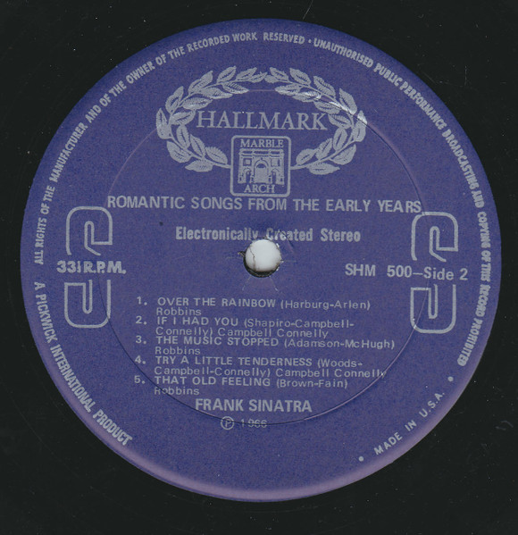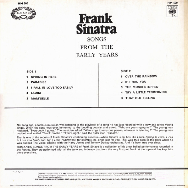 On Sleeve there is 'CBS' logo and 'Hallmark Series' logo, cat.no. is HM 500 & there's written Made in England and Distributed by Pickwick International Inc.