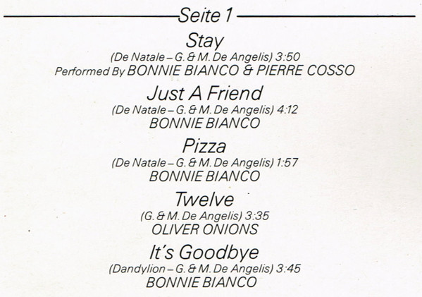 | A1 | Bonnie Bianco & Pierre Cosso– | Stay | 3:50 |