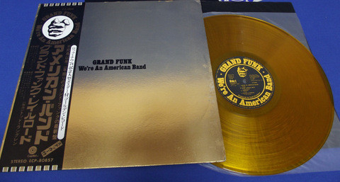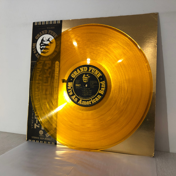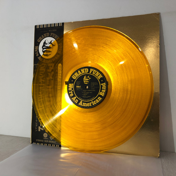 First Japanese pressing released in gold vinyl and foiled or matte golden gatefold cover. Also included a set of four round stickers with band and album name, 12 pages booklet and OBI. Initial copies came with large folded poster.