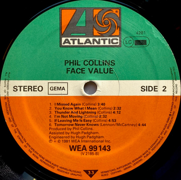 Release 10191068 - Almost like above (2277278) - minimal layout differences (Artist/Title), "Face Value" almost completely inside the pressing ring around the spindle hole. In addition A side runouts with STRAWBERRY, B side runouts with TOWNHOUSE.