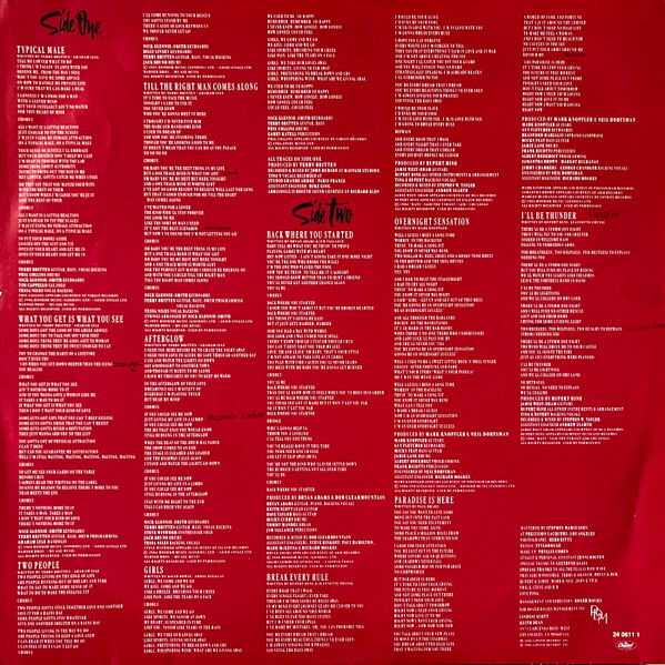 - Producer – Bryan Adams (tracks: B1), Mark Knopfler (tracks: B3, B4), Neil Dorfsman (tracks: B3, B4), Rupert Hine (tracks: B2, B5), Terry Britten (tracks: A1 to A6)