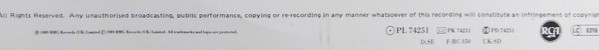 Rear sleeve: All Rights Reserved. Any unauthorised broadcasting, public performance, copying or re-recording in any manner whatsoever of this record willconstitute an infringement of copyright.