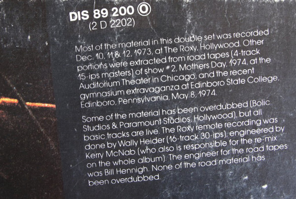 Most of the material in this double set was recorded Dec. 10, 11 & 12, 1973, at the Roxy, Hollywood.