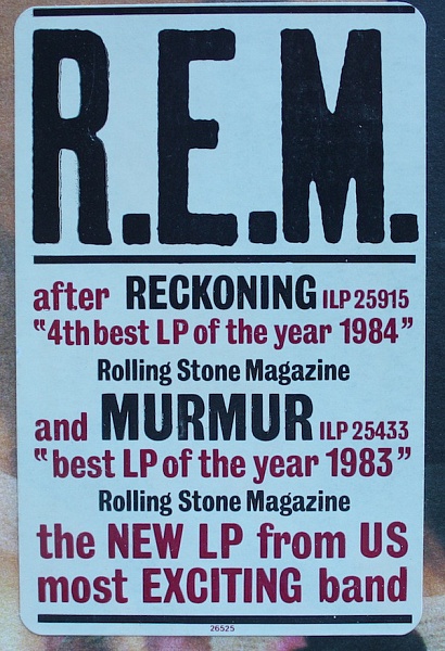 - "Fables of the" R.E.M. [from left to right] "Reconstruction Of The" R.E.M. [from right to left] on spine