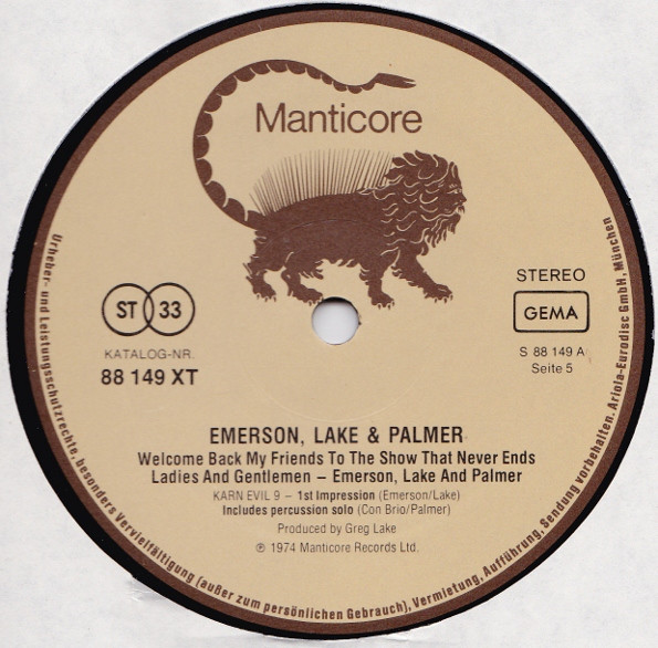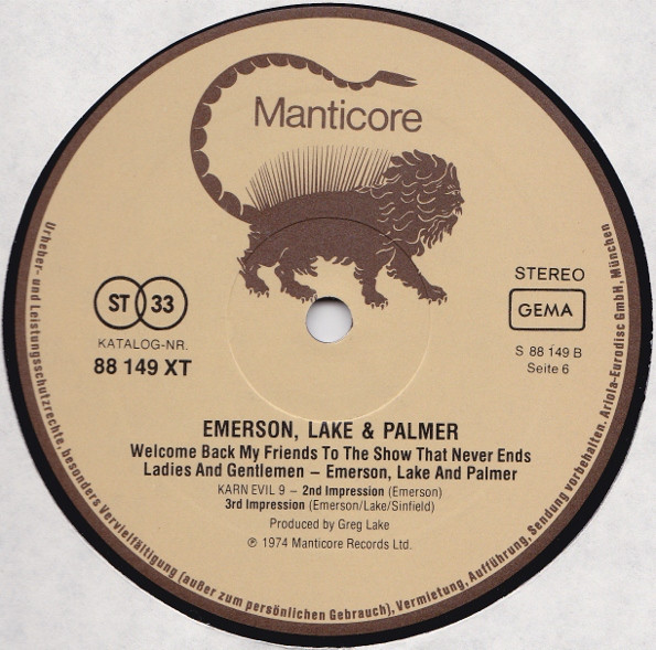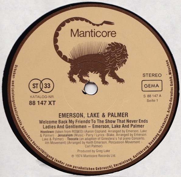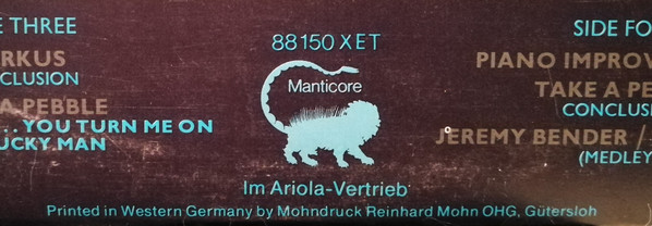 Release 10504281 - text on sleeve back is "Im Ariola-Vertrieb - A Manticore Recording Distributed by WEA Records Limited"