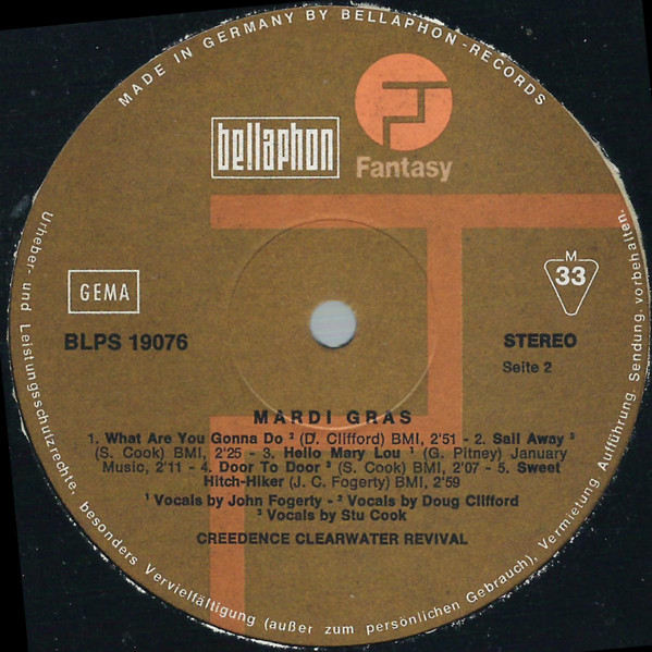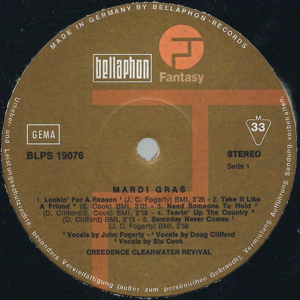 - Vocals – Doug Clifford (tracks: A3, A4, B1), John Fogerty (tracks: A1, A5, B3), Stu Cook (tracks: A2, B2, B4)