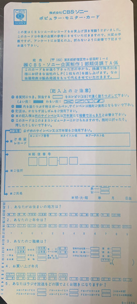 With obi, 4-page picture/lyric/liner notes insert, and CBS Sony questionnaire postcard.