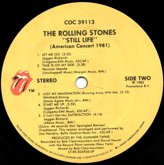 Label variation, pressed at SRC. Unlike The Rolling Stones - Still Life (American Concert 1981), this label has a ")" after "ASCAP." in the third line of Intro description and has BMI and ASCAPS rights printed for all tracks with each song title.
