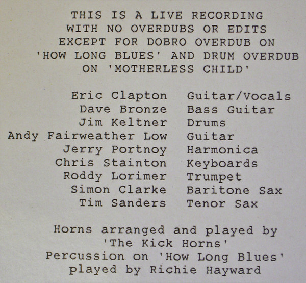 This is a live recording with no overdubs or edits except for dobro overdub on "How Long Blues" and drum overdub on "Motherless Child."