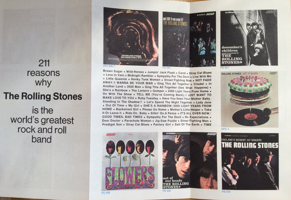 Includes an insert titled "211 reasons why The Rolling Stones is the world's greatest rock and roll band" with album covers and songs.