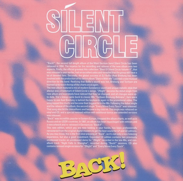"Back!", the second full-length album of the West German band Silent Circle has been released in 1994. The impetus for the recording and release of the new album two aspects. Firstly, the official greatest hits collection "Best Of Silent Circle Volume II", that was released a year earlier, had an excellent sales and revealed that the group still have a lot of devoted fans. Secondly, the global success of DJ BoBo (Axel Breitung has been involved with the production of his debut album "Dance With Me") pointed a new musical direction for the band. Realizing that BoBo`s sound was hot, Breitung and Tychsen are teamed up to reach the top of the charts once again.