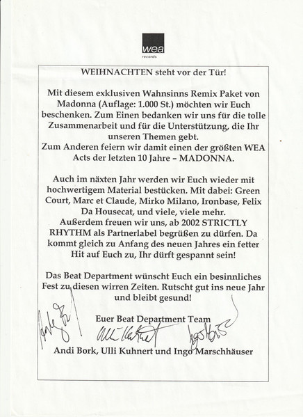Track A1 (on label, misprint): PRODUCED BY MADONNA, GUY SIGSWORTH AND WILLIAM ORBIT