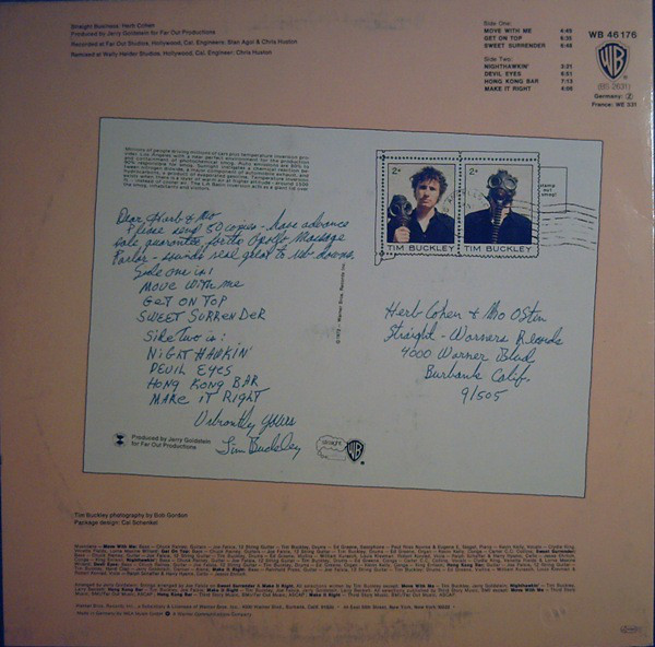 Back: "Straight Business: Herb Cohen. Recorded at Far Out Studios, Hollywood, Cal., remixed at Wally Heider Studios, Hollywood, Cal".