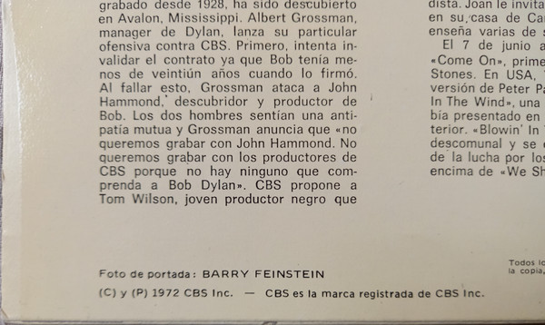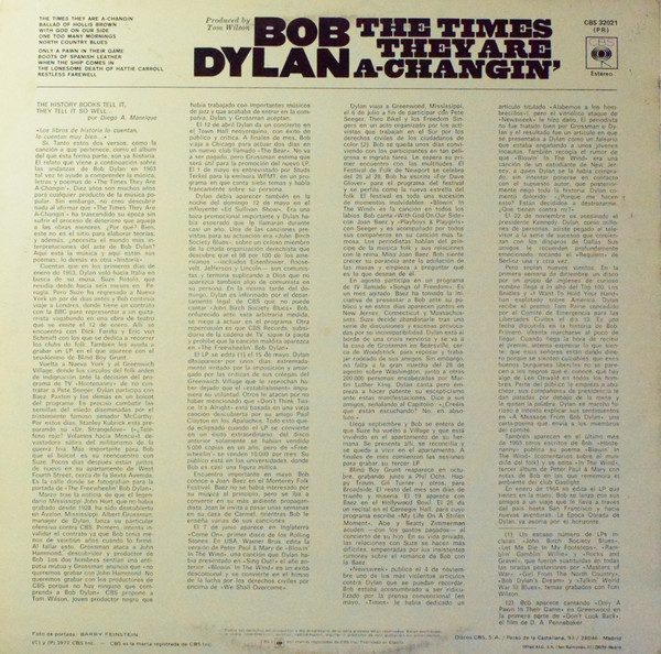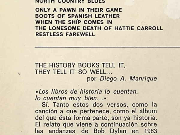 Entirely different Spanish Liner Notes By Diego A. Manrique, which are some kind of biographical account about Bob Dylan's wanderings in 1963 (Original Liner Notes, "11 Outlined Epitaphs" by Bob Dylan, were omitted)