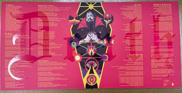 Full-colored gatefold jacket with cut-out, inside-out print and UV lacquer, flooded black inside.