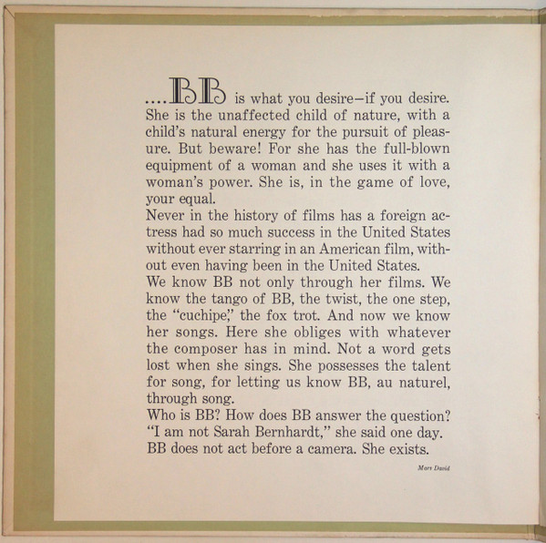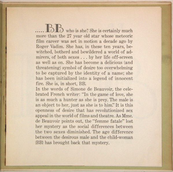 Gatefold with stapled in booklet and fold-out poster of Ms. Bardot.