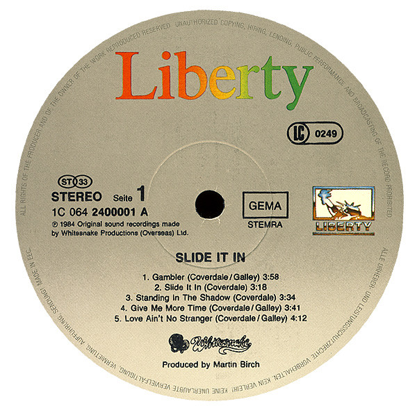 Similar to Slide It In but with different artwork on labels and a tour program (European tour dates for 1984) on the rear sleeve.